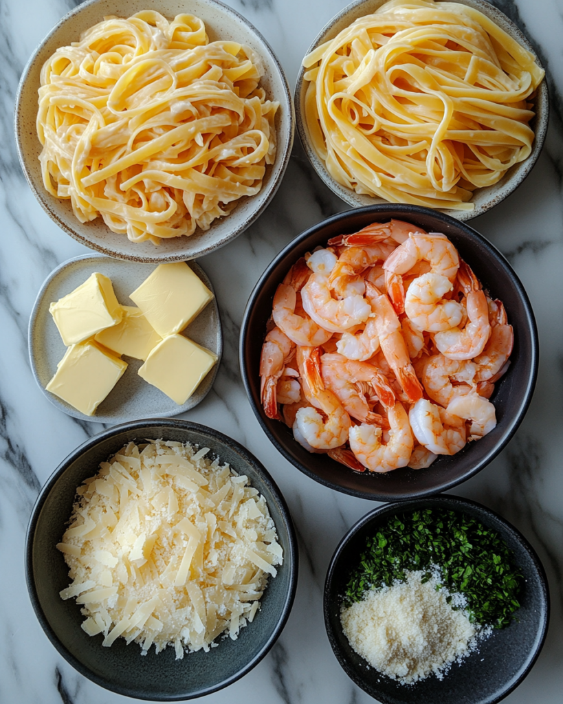 Shrimp Alfredo depends on a short list of ingredients, but each one plays an important role in flavor and texture. Shrimp is the main protein, bringing a naturally sweet and slightly briny taste. Medium or large shrimp work best because they stay juicy and do not disappear into the sauce.