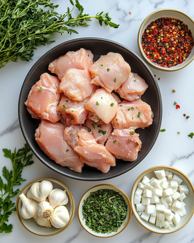 Chicken thighs form the foundation of this dish because they remain tender during oven roasting due to higher fat content compared with lean cuts. Bone-in and skin-on pieces are preferred since the bone supports heat distribution and the skin develops a roasted surface during baking.