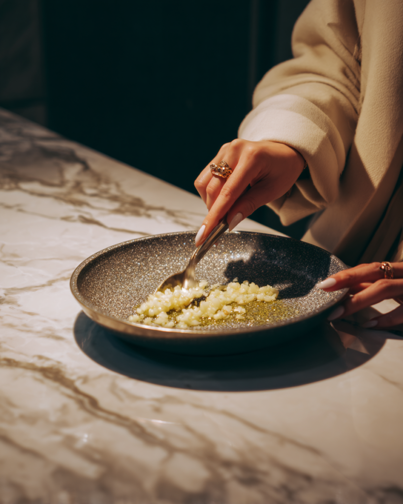 - Heat the olive oil in a large skillet over medium heat. Once warm, add the thinly sliced garlic. Fry gently, stirring often, until golden brown and aromatic, about 1–2 minutes. Avoid burning the garlic, as it will turn bitter and ruin the dish.